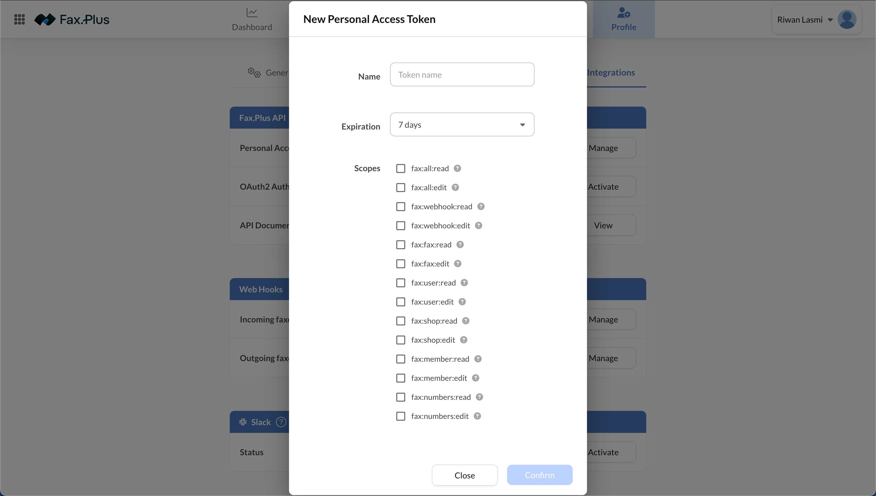 Fax:all:edit- Voller Zugriff auf alle Fax-bezogenen Operationen- Faxe, Benutzer, Mitglieder, Webhooks und Nummern verwalten