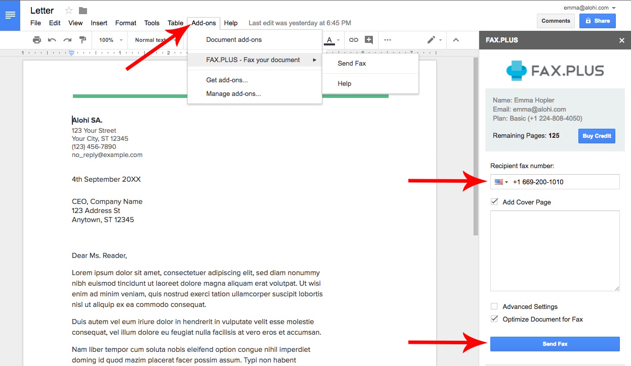 - Click on Add-ons from the document's tab, then select Fax.Plus - Fax your document. Click on Send Fax to open the Fax.Plus sidebar menu.