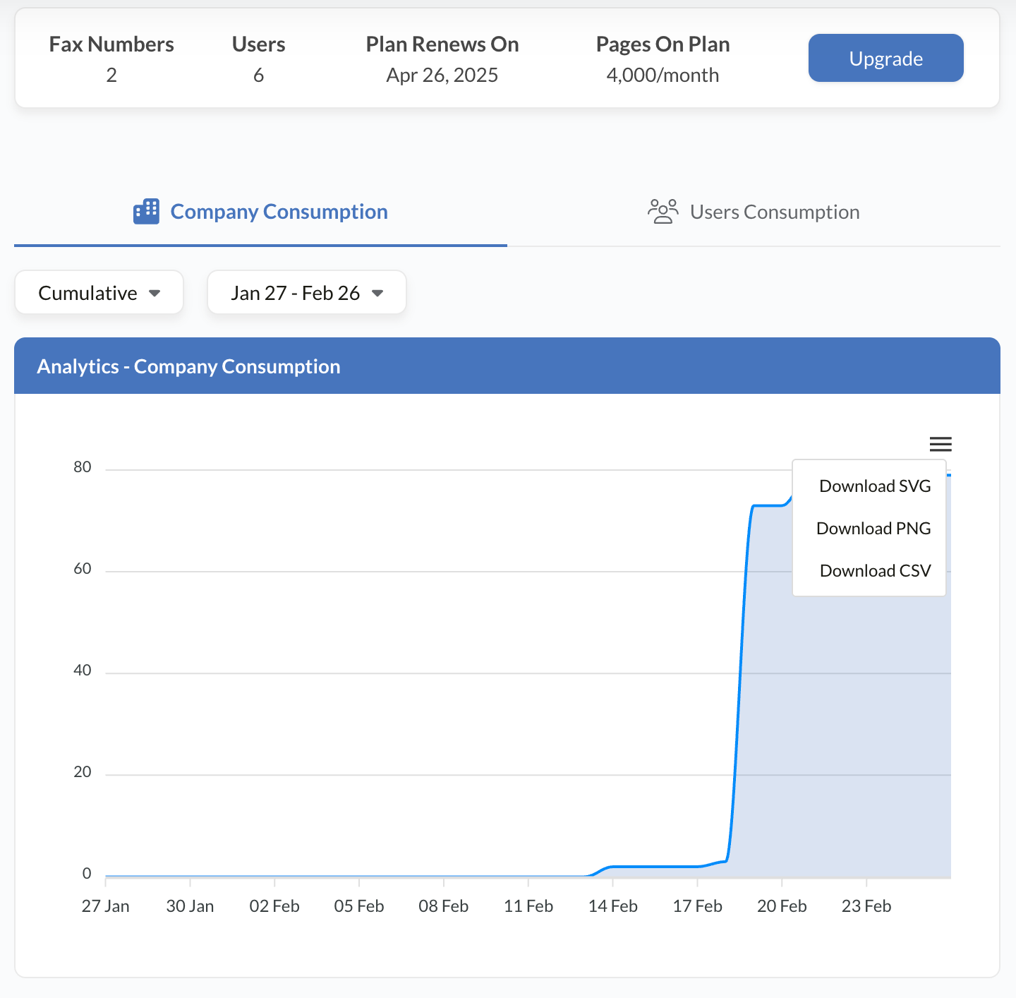 - An in-depth user consumption report showcasing the quantity of faxes sent and received by each member within your corporate account, during various billing cycles of your selection.