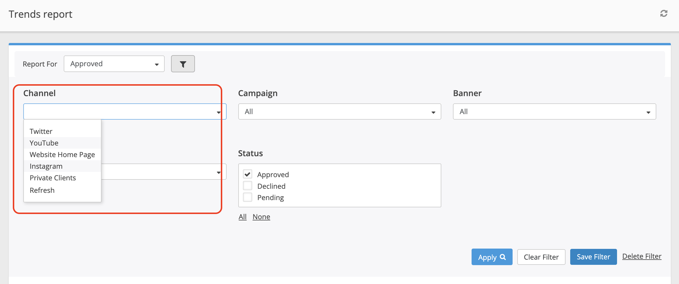 You can navigate to the Reports section and use the Channel filter to track the performance of a specific channel. All your custom channels will be listed under the Channel filter, allowing you to easily monitor their performance.