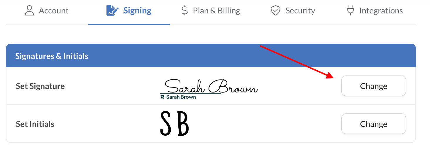 - Under the tab for Signing, find Signatures & Initials. Click on Change.
