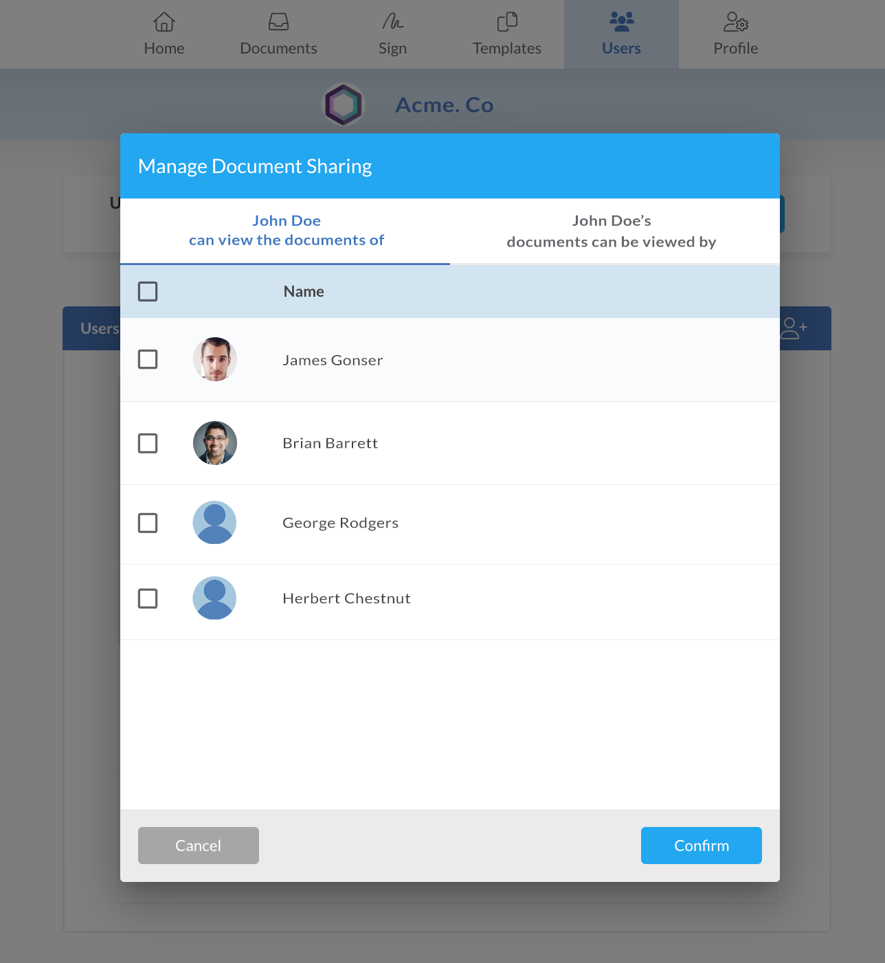 Document Sharing allows Owners and Admins to control the document viewing permissions for all their team members. They can grant each team member the permission to view the documents of one or multiple team members.