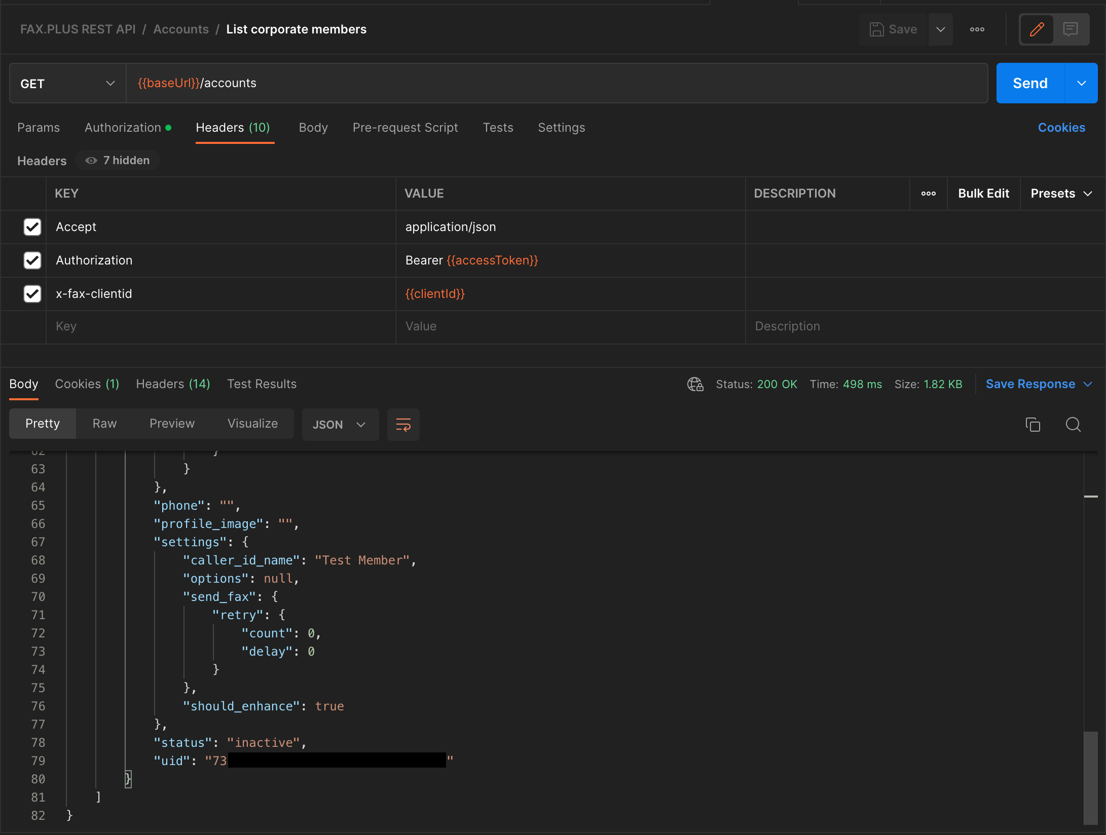 Para obtener la lista de todos los miembros corporativos, inicie una solicitud HTTP GET a la siguiente URL: https://restapi.fax.plus/v3/accounts/.