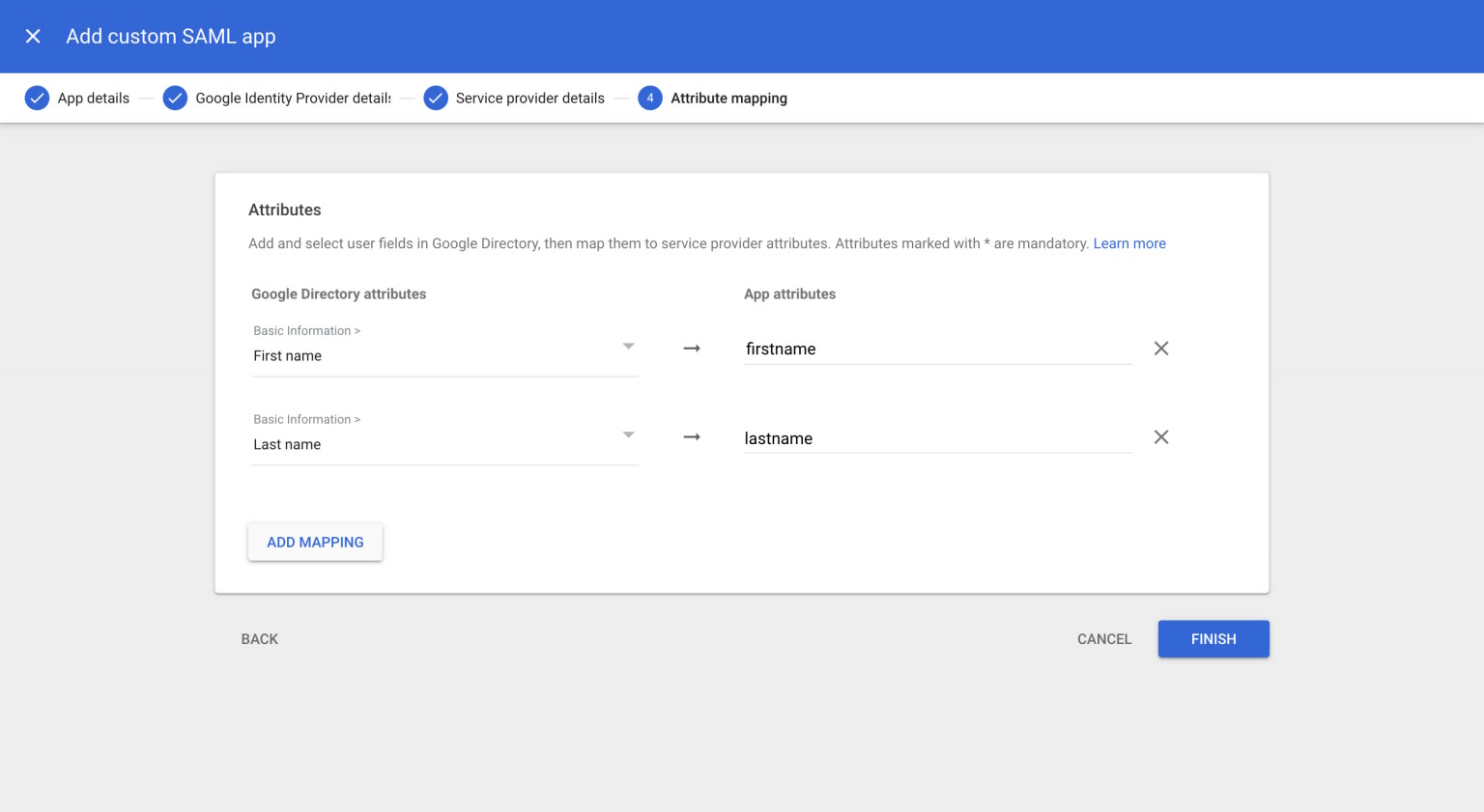 - En la sección para Mapeo de Atributos, Asegúrese de añadir el Nombre y Apellidos con "nombre" y "apellido" como atributos.
