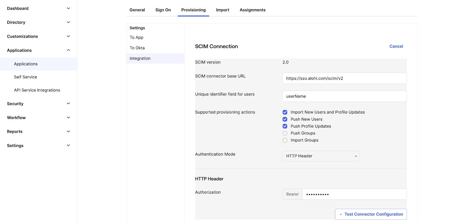 URL base del conector SCIM: https://sso.alohi.com/scim/v2 Campo de identificación único para los usuarios: usuario/a Acciones de provisión soportadas: - Importar nuevos usuarios y actualizaciones del perfil
