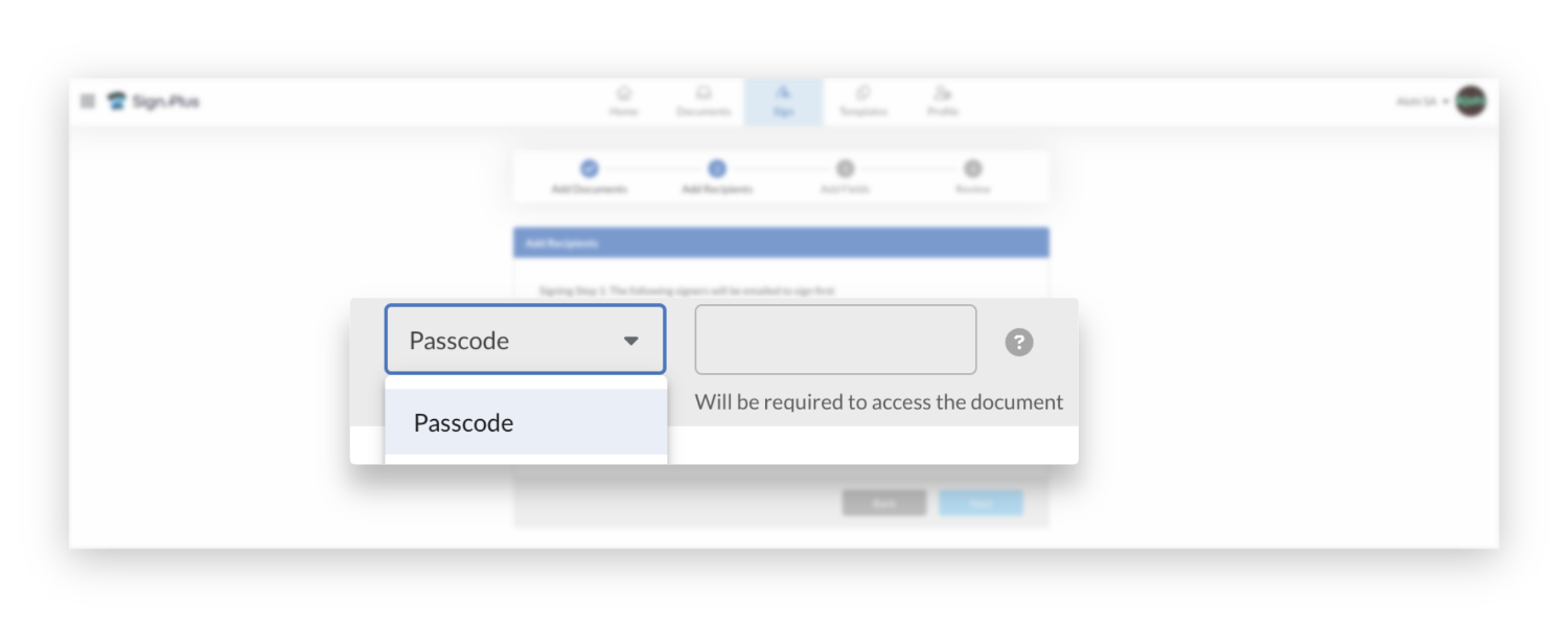Seleziona Passcode dal menu a discesa. Apparirà un campo di testo dove puoi inserire un codice di accesso univoco. Questo codice di accesso da 4 a 50 caratteri sarà richiesto al destinatario per accedere al documento.
