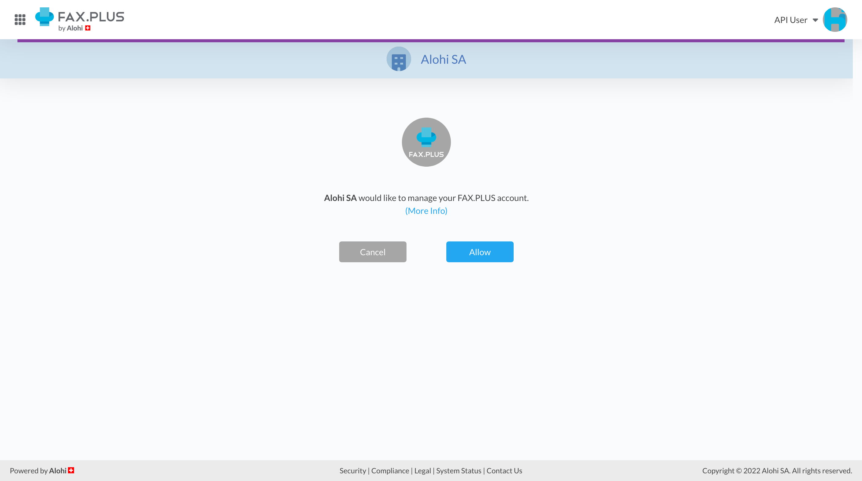 Fax.Plus API を使用するには、最初に API がアカウントにアクセスする許可を与える必要があります。 承認プロセスが完了すると、アカウントにログインできます。