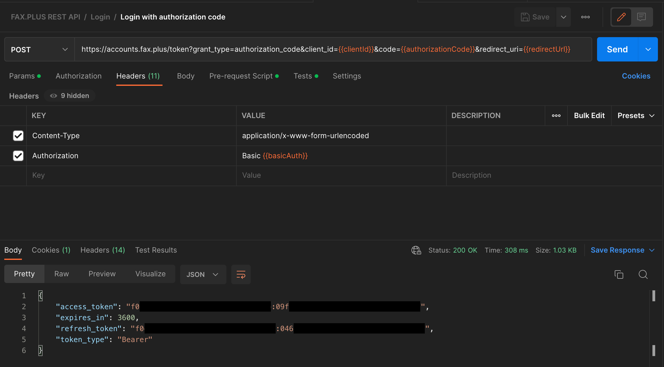 After you have successfully authorized access, you can proceed to perform an HTTP POST to the following URL: https://accounts.fax.plus/token?grant_type=authorization_code&client_id=[client ID]&code=[authorization code]&redirect_uri=[redirect URI].