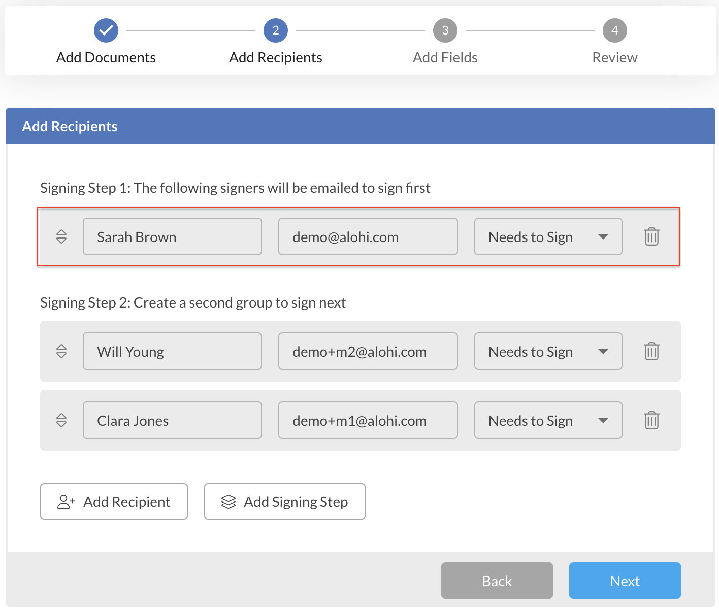 When utilizing the Request Signature tool, you can include recipients by using the Add Recipients feature and include yourself as a signer. 監査証跡には、あなたの名前とメールアドレスがイニシエーターとしても署名者としても表示されます。