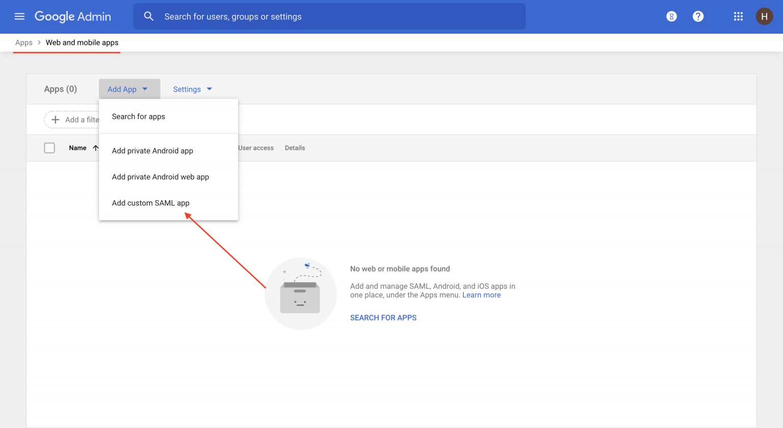 - Faça login no seu console de administração do Google, encontre Aplicativos e vá para aplicativos Web e móveis.