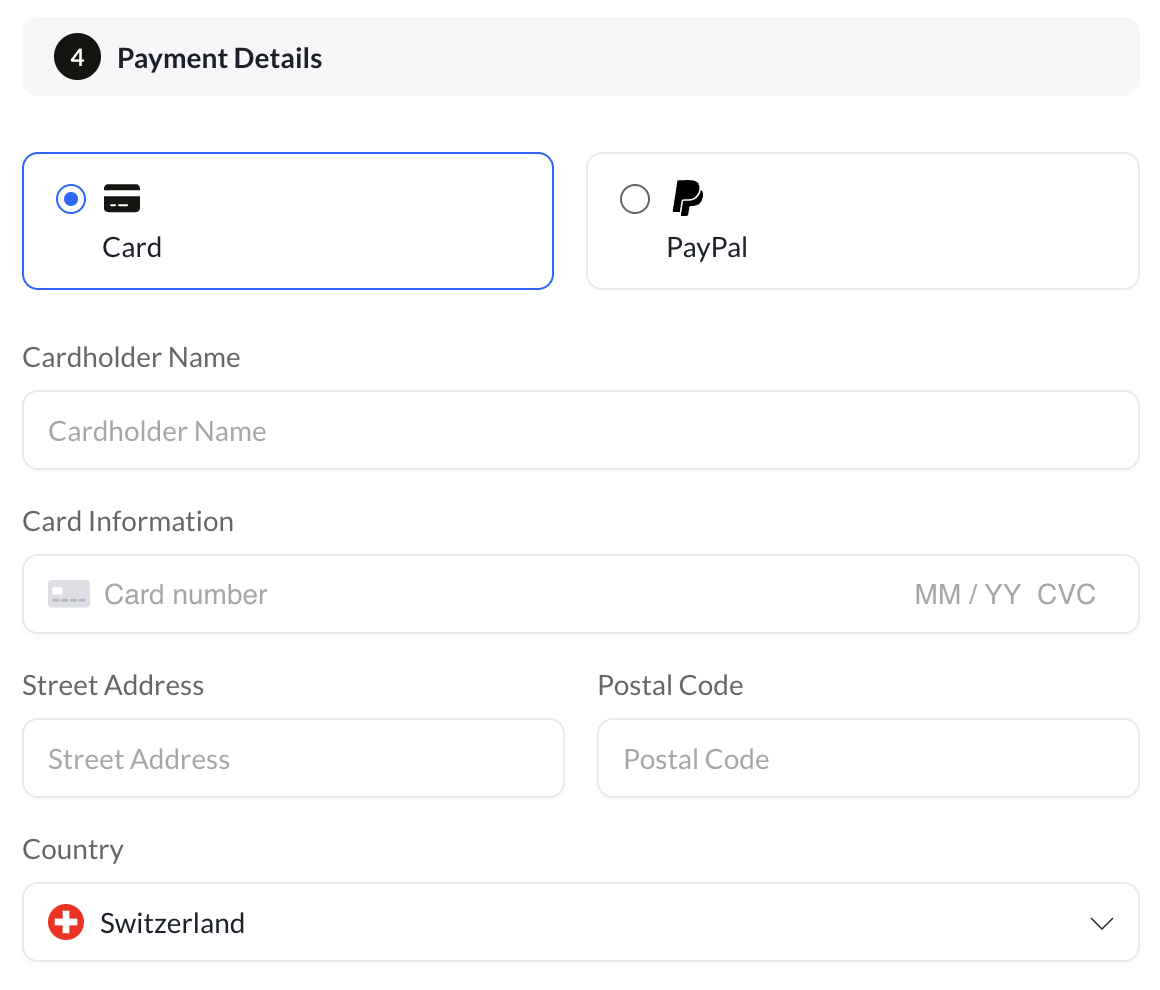 - Under Payment Details, click on Credit Card or PayPal.
