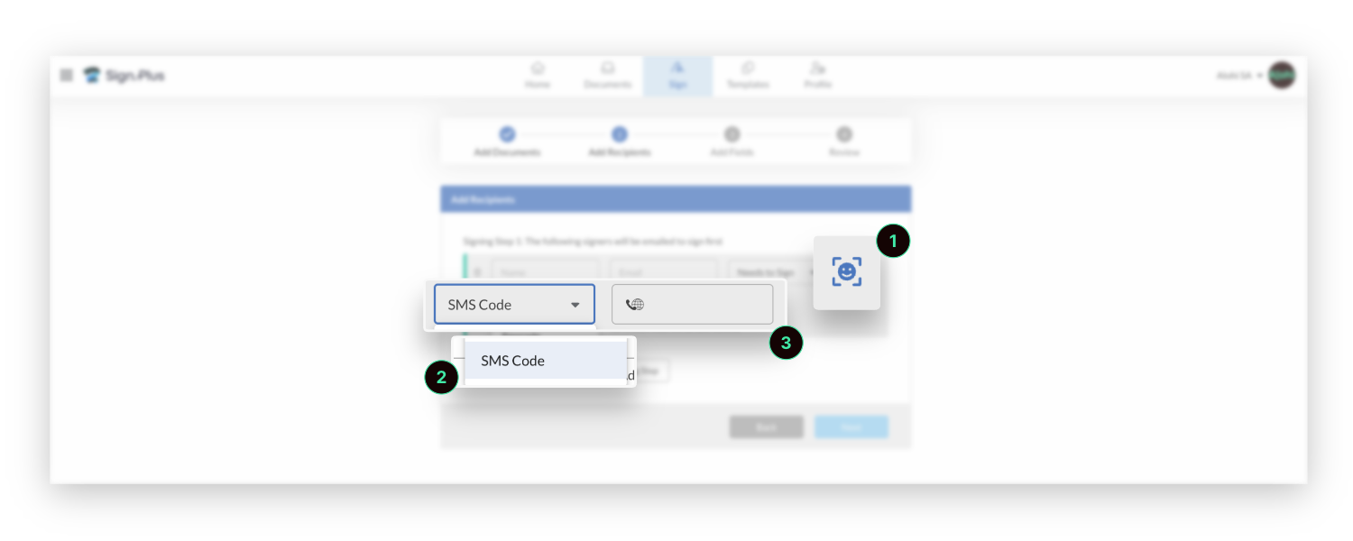 - Выберите SMS из выпадающего меню (указывается [2] на изображении). В появившемся текстовом поле (помечено как [3] в изображении), введите мобильный номер получателя. Этот шаг обеспечивает доступ только назначенным получателям и подписывать документ с помощью уникального SMS проверочного кода, отправленного на их телефон.