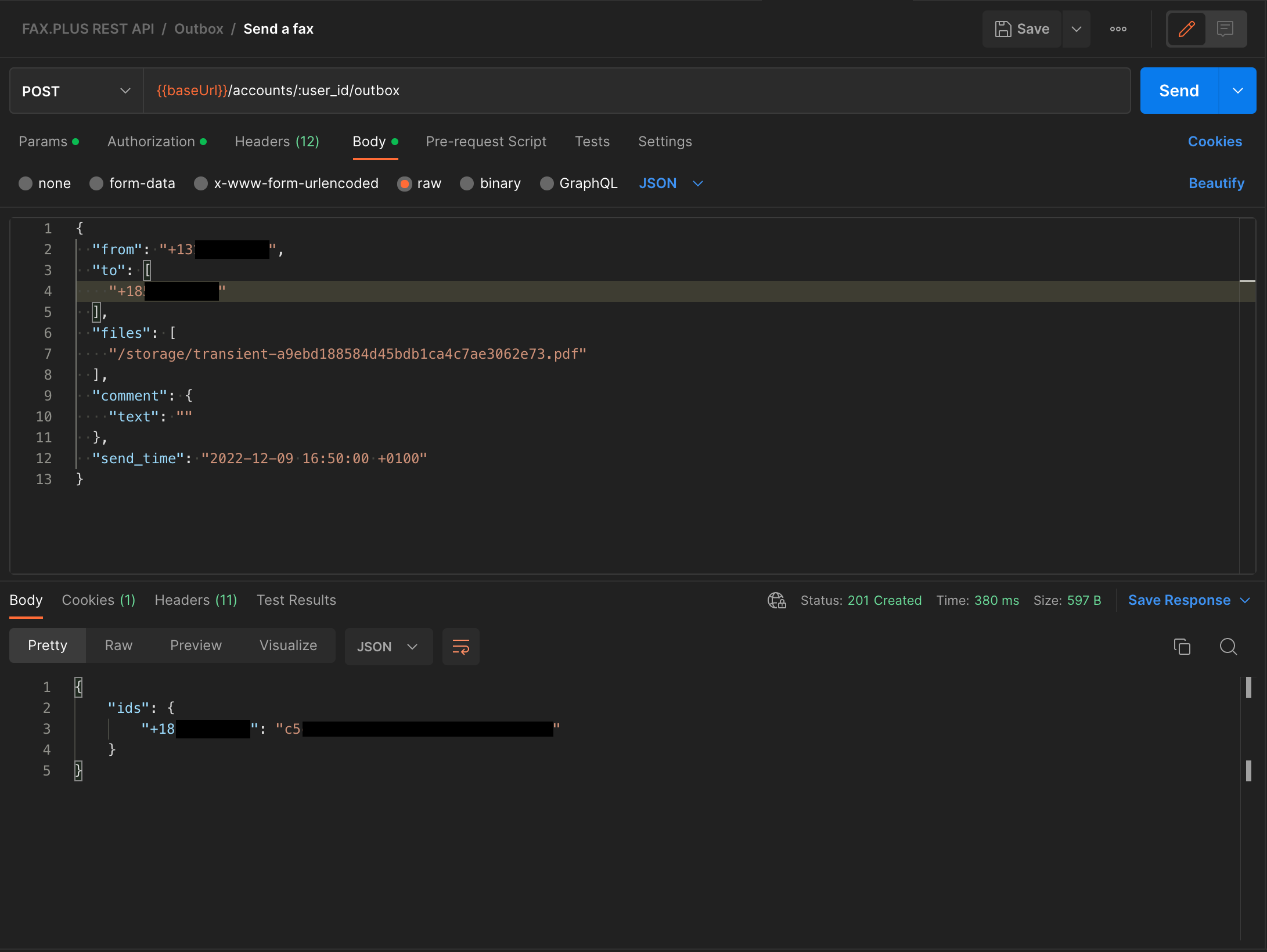 备注: 传真与我们的 API 关联多个ID。 这种设计之所以存在,是因为传真传输运行异步操作。 具体而言,将用两个不同的ID标明发出的传真号码:发件箱ID,它在传真成功发送之前起到了作用。 和传真ID,它在成功传送后成为传真的确定标识符。